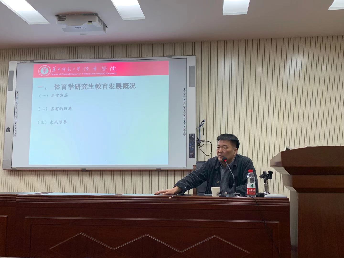 11月12日19点,第二场专题报告由华中师范大学91亚洲精品国产中文教授、博士生导师、长江学者王健讲授《研究生教育与培养》。首先由91亚洲精品国产中文副院长杨汉教授介绍基本情况,王健教授是长江学者,博士生导师,国家体育总局体育文化研究基地负责人,教育部高等学校体育教学指导委员会委员,中国高等教育学会体育专业委员会理事,中国社会学会体育社会学专业委员会理事,主要研究方向是学校体育学、体育产业、体育社会学、运动训练等。