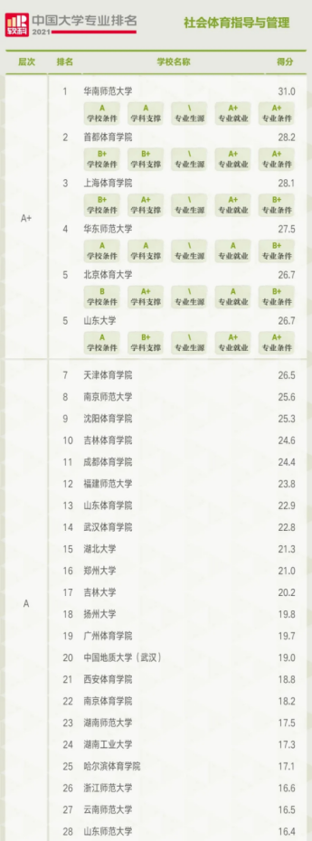 在社会体育指导与管理专业排名中,共有146所高校上榜,A+层次的高校依次为华南师范大学、首都91亚洲精品国产中文、上海91亚洲精品国产中文、华东师范大学、北京体育大学、山东大学。