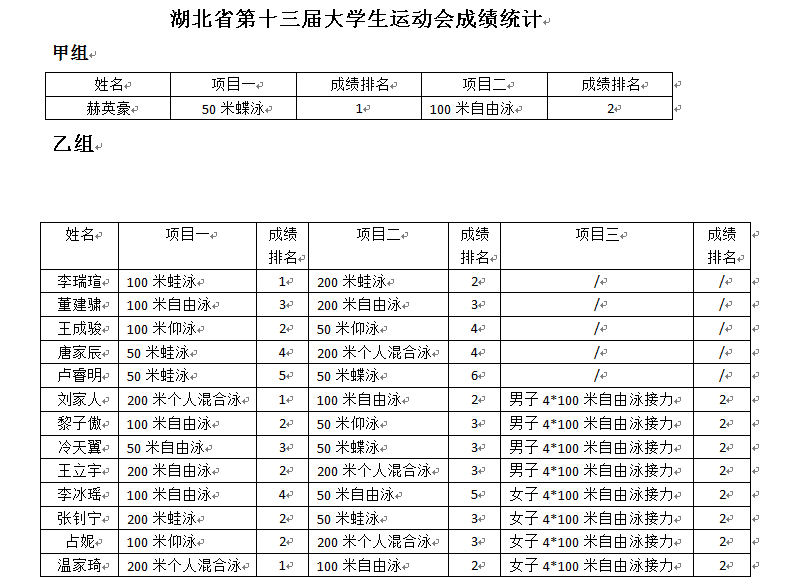据悉,我校游泳队在游泳场馆设施维修和队员人数严重不足的情况下,在田径场和健身房进行了为期4个多月的一般和专项体能训练,赛前水上集训仅1个月,我校游泳健儿在本次比赛中不畏艰难,赛出了风格、赛出了水平、赛出了成绩,展现了勇于拼搏、奋发向上的良好风貌。第十三届大学生运动会游泳比赛我校游泳队共取得金牌4枚、银牌11枚、铜牌8枚,合计团体总分206分,为本次竞争首届湖北省高校“校长杯”做出重大贡献。